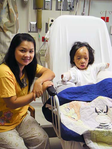 The wounds on her face are healing up nicely. To reduce scarring, Boun Lod wears a hard plastic mask except when she’s eating. While the mask isn’t very comfortable, especially on hot days, she wears it without complaint.